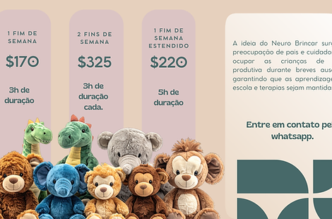 O Programa Neuro Brincar é um serviço de cuidado infantil especializado, realizado no domicílio, que une brincadeiras lúdicas e dirigidas ao estímulo do desenvolvimento da criança. Por meio de jogos, movimento, músicas e interação com intencionalidade pedagógica, promove a estimulação de habilidades cognitivas, sociais e emocionais, enquanto os responsáveis dispõem de tempo seguro para autocuidado ou compromissos pessoais.